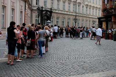 Podobná situace v Uměleckoprůmyslovém muzeu. Zatímco podle fronty se o kubismus zajímají spíše studentky uměleckých škol (o pražském, zejména architektonickém, kubismu, mnoho lidí ani netuší), do uměleckoprůmyslového muzea se odvážili snad všichni. Nevětrané sály, vitríny obsypané občany dychtícími po kulturním zážitku...nedalo se dýchat. Expozice zabírala jenom jedno patro takže, nic moc. Na druhou stranu, i to málo co "bylo možno viděti", místy stálo za to. Expozice svatebních šatů za posledních 12 desetiletí, šperky, porcelán.