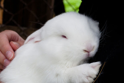 Králíčátka od staré králice. Narodily se jenom dvě, proto jsou tak velké. Dvojčata je za poslední týdny pořád nosila takže se vůbec nebojí.