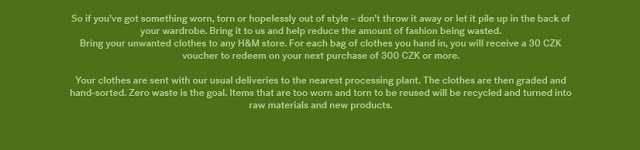 Wow. řekla jsem si ,když jsem o tom poprvé četla a poprvé dostala do ruky onen letáček (na kterém je 00nic informací). Celá nadšená jsem protřídila šatník, vyřadila to, co už nenosím a nosit nebudu, ke stejném aktu přesvědčila mého muže a těšila se, jak dorazím s úsměvem na tváři na Příkopy a pořádně si užiju nakupování. Jenže stránky pořád nefungovaly, nejely...až se mi jednoho dne povedlo je spustit a zůstala jsem koukat jako opařená. Ehm, jasně, super sleva. To je fakt cool. Možná že tomu nerozumím dobře, stránka je psaná v angličtině, ale mám takový dojem, že za odevzdanou tašku hader dostanete slevový kupón na 30 Kč, uplatnitelný pouze v případě, že nakoupíte nad 300 Kč. AHA.