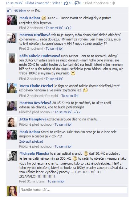 Jakože vím, píše se, že HM z celého projektu nemá žádný zisk, protože všechny prachy, které na dvou až třech kg použitého textilu získá, dá právě na tyhle slevy ale...pokud můžou být během slevového období ceny nižší až o 70%, tak to si třiceti korunami nikdo do marže zase tak moc nesáhne, ne?